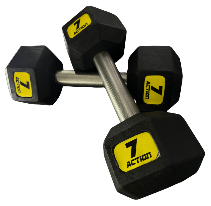 Halter Sextavado Action Gym: hexagonal anti-rolamento, pegada inox, blindagem anti-impacto e ruído. Seguro e durável para funcional e HIIT. Treine sem preocupações!